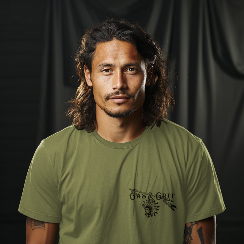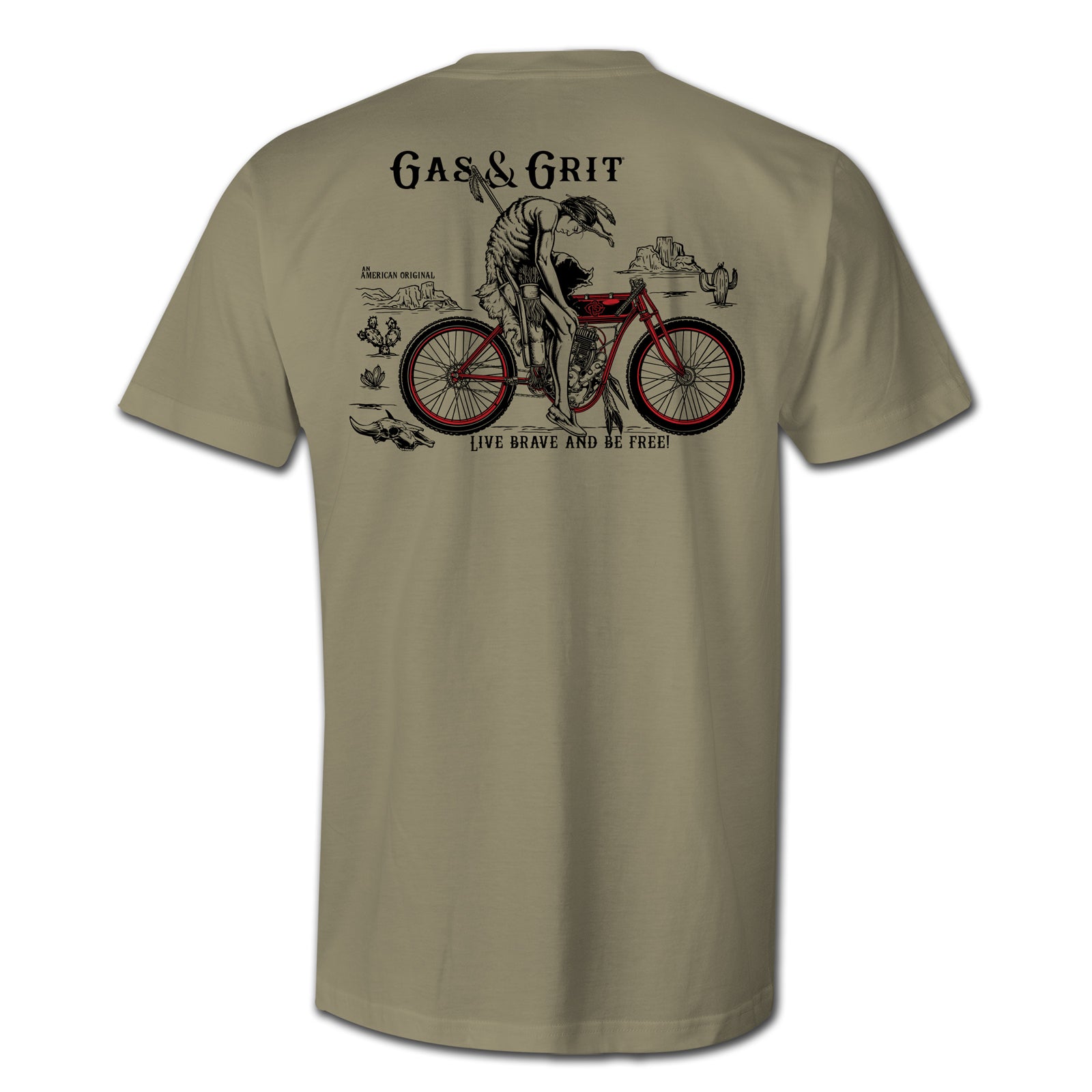 Celebrating vintage motorcycles and those pioneer first riders. Our Gas & Grit Last Ride design is printed on a soft 100% cotton, premium short sleeve tee in Lt. Olive.